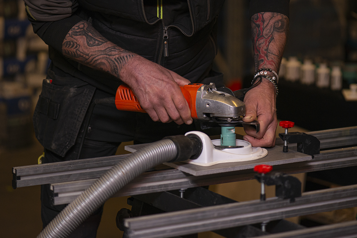 KGC har marknadens bredaste sortiment av dammfångare för plattsättare och andra yrkesgrupper som arbetar med sten, kakel och betong. Produkterna monteras direkt på vinkelslipen och kopplas till dammsugare – en enkel åtgärd som reducerar dammet med i snitt 90 procent.