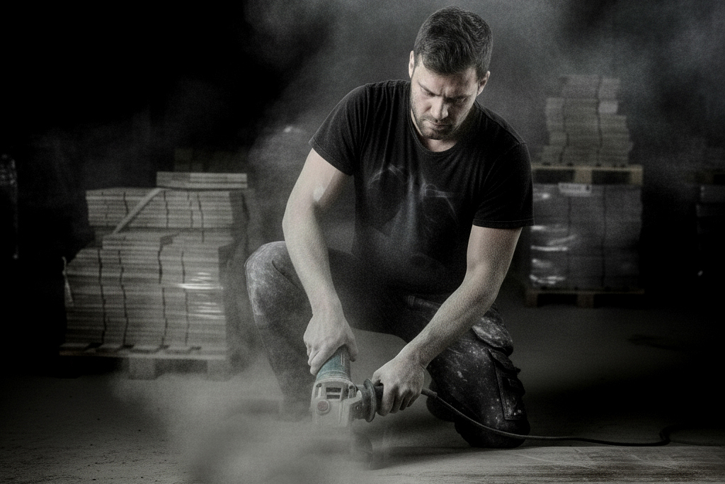 När plattsättare kapar, slipar eller borrar i granitkeramik och sten frigörs kvartsdamm. Mikroskopiska partiklar som kan orsaka KOL, silikos, lungfibros och cancer. Varje år drabbas över hundra svenska hantverkare av obotliga lungsjukdomar kopplade till dammexponering.
